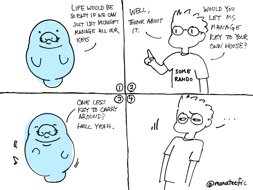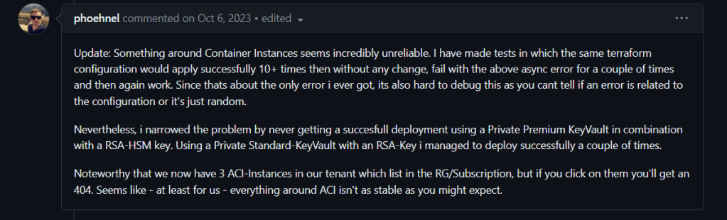 So that’s it! Looking back at it, I spent too much time assuming that it was the Logic App workflow that needed the Key Vault Crypto access since it is the one initiating the deployment. Once I know the answer, it is fairly obvious that the ACI is the one that needs Crypto access so that it can encrypt itself.